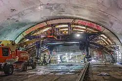 Cavern drilling was finished in August 2012;[48] however, blasting for the station entrances was not completed until February 28, 2013.[49][50] Demolition of a muck house, erected in August 2011[51] to remove mud from the tunnels, was finished by October 2013.[52] By January 2013, almost 96.3% of excavation was completed, with 177,873 cubic yards (135,994 m3) of dirt excavated from the station; waterproofing was also being done in the station and the tunnels south of it.[53][54] The contract for the station's finishing touches, including the electrical, plumbing, track, and signal systems, as well as entrances and exits, was awarded to Judlau Contracting at a price of $258 million in February 2013.[55] As of May 12, 2014, the mezzanine level of the station was completed and being used to store equipment.[56] In September, the station's size was gauged by Gothamist to be so large that "55,000 elephants could fit" within the enormous cavern.[57]