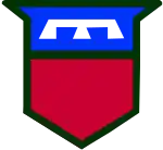 • Shoulder patch: An escutcheon with a red field and a blue chief, separated by an olive drab line; a three-pronged white device is superimposed on the blue chief.
