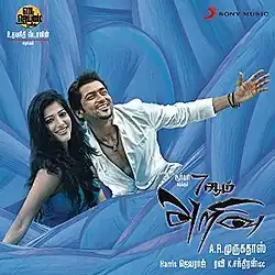 7 Aum Arivu is the soundtrack to the 2011 film of the same name directed by A. R. Murugadoss and starred Suriya, Johnny Trí Nguyễn and Shruti Haasan. The music and original score is composed by Harris Jayaraj in his second collaboration with Murugadoss after Ghajini (2005). The film consisted of six tracks written by Pa. Vijay, Na. Muthukumar, Kabilan and Madhan Karky, the latter wrote a song in Chinese language. The soundtrack was released at the launch event held in Chennai Trade Centre on 22 September 2011, with Sony Music India distributing the album in digital and physical formats. The soundtrack to the Telugu-dubbed version 7th Sense was also released on the same date.
