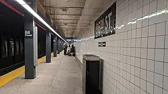 This station has three fare control areas, all of which are on the upper level. The full-time one at 86th Street is at the south end and has a turnstile bank, token booth, and three street stairs. Two staircases lead to the southwest corner of Central Park West and 86th Street, and one leads to the northwest corner of that intersection. Right inside fare control, there is a staircase going down to the lower level.[23] The station's other two entrances/exits are unstaffed. The one at 87th Street, at the center of the upper level, has a staircase connecting both platforms. The one street stair leads to the northwest corner of Central Park West and 87th Street.[23] The third fare control area at 88th Street has three turnstiles and one gate, installed as part of the station's renovation. These replace the two HEET turnstiles and one exit-only turnstile[23] which were present beforehand. There is one staircase leading to the northwest corner of Central Park West and 88th Street.[23]