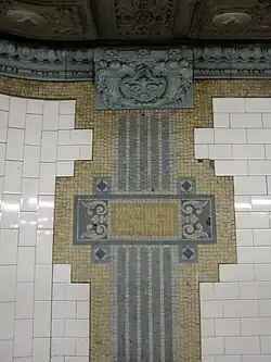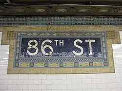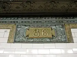This station retains original mosaic and terracotta wall reliefs, consisting of purple characters surrounded by yellow and blue tiles. The tiled pilasters on the side walls are interrupted by tiled rectangles, as well as motifs of little squares and semicircles.[46] The decorations also include cornucopia designs with the number "86". There are also a few "Men" and "Women" relief signs for now-defunct restrooms.[44]: 37 The mosaic tiles at all original IRT stations were manufactured by the American Encaustic Tile Company, which subcontracted the installations at each station.[44]: 31 The decorative work was performed by tile contractor Alfred Boote Company and faience contractor Rookwood Pottery Company.[44]: 37 The ceilings of the original platforms and fare control areas contain plaster molding.[44]: 10 At the northern part of the station, where the platforms have been extended, the walls have cream-colored tiles with a pink trim line and black "86th ST" written on them at regular intervals.[47]