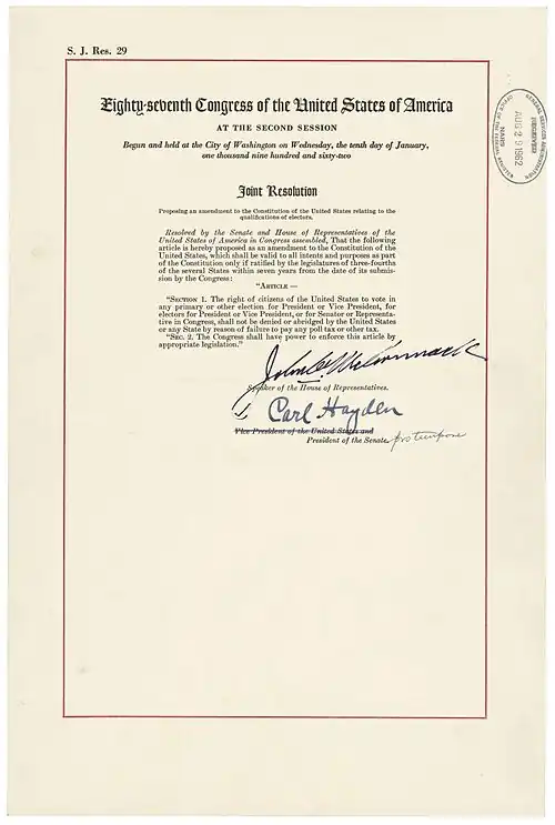 The official Joint Resolution of Congress proposing what became the 24th Amendment as contained in the National Archives