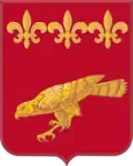 • Shield: Gules a falcon striking bendsinisterwise, in chief three fleurs-de-lis fess Or.