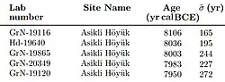 - ^ Thissen, L. 2002. Appendix I, "The CANeW 14C databases, Anatolia 10,000-5000 cal. BC". In "The Neolithic of Central Anatolia. Internal developments and external relations during the 9th–6th millennia cal BC", Proc. Int. CANeW Round Table, Istanbul 23–24 November 2001, edited by F. Gérard and L. Thissen. Istanbul: Ege Yayınları.