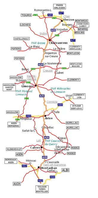 The A20 autoroute or L'Occitane is a highway through central France. A part of France's national network of autoroutes, it is 427 kilometres (265 mi) long.