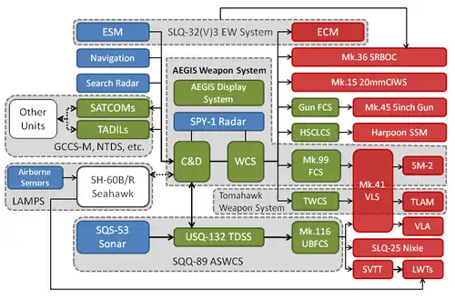The computer-based command-and-decision (C&D) element is the core of the Aegis Combat System and came from the Naval Tactical Data System (NTDS) threat evaluation and weapons assignment (TEWA) function.[5] This interface makes the ACS capable of simultaneous operation against almost all kinds of threats.