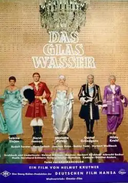 A Glass of Water (German: Das Glas Wasser) is a 1960 West German comedy-musical film directed by Helmut Käutner and starring Gustaf Gründgens, Liselotte Pulver and Sabine Sinjen. It was entered into the 10th Berlin International Film Festival.[1] It is an adaptation of the 1842 French play Le verre d'eau by Eugène Scribe and is set in London in 1710 during the War of the Spanish Succession. It was shot at the Wandsbek Studios in Hamburg. The film's sets were designed by the art director Albrecht Becker and Herbert Kirchhoff.