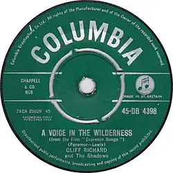 "A Voice in the Wilderness" is a song by Cliff Richard and the Shadows, released as a single in January 1960. It peaked at number 2 on the UK Singles Chart and also received a silver disc for 250,000 sales.[2][3]
