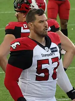 On October 27, 2017, he tore his anterior cruciate ligament and meniscus, but still finished the game.[4] He had reconstructive surgery in Hamilton and rehabbed his knee there, instead of heading home to Medicine Hat, Alberta.[4] He became a free agent in 2018 and when he was healthy, he re-signed with the Tiger-Cats on July 23, 2018.[5] He played in 13 regular season games and two post-season games in 2018.