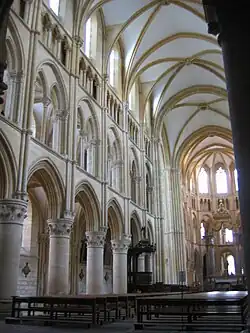 Despite the length of time between the beginning of the construction of the chevet and the choir and the end of the rebuilding of the transept and the nave, the style within the abbatial church is relatively homogeneous. The building is vaulted on ribbed crossings, with sexpartite vaults in the middle and quadripartite vaults in the choir.[12][19]