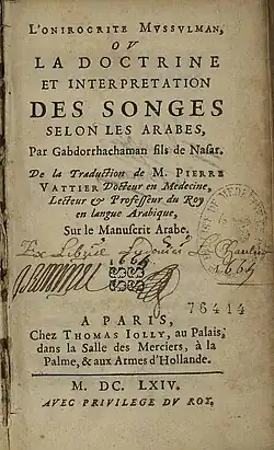 - Khulāṣat al-kalām fī taʾwīl al-aḥlām is a work on the interpretation of dreams.[7] It was translated into French by Pierre Vattier and published at Paris in 1664 under the title L'Onirocrite mussulman ou la Doctrine et interpretation des songes selon les arabes par Gabdorrhachaman fils de Nasar.[2]