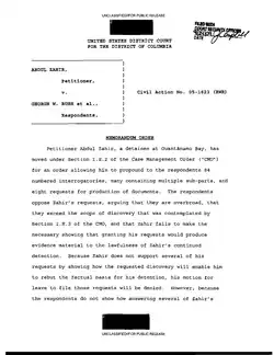 - Abdul Zahir was listed as one of the captives who "deny affiliation with Al Qaeda or the Taliban yet admit facts that, under the broad authority the laws of war give armed parties to detain the enemy, offer the government ample legal justification for its detention decisions."[20]