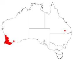 This species of Acacia grows in open woodland, woodland or forest in sand, loam or laterite, often in winter-wet depressions from near Jurien Bay to Albany, Western Australia in the Avon Wheatbelt, Esperance Plains, Geraldton Sandplains, Jarrah Forest, Swan Coastal Plain and Warren bioregions of south-western Western Australia.[2][3][4][5]