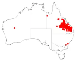 Bancroft's wattle usually grows in shallow soil on rocky hillsides in woodland or open forest and is common between Collinsville and Crows Nest but is also known from near Tambo and White Mountains National Park.[2][3]
