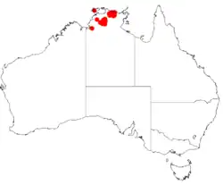 This species is endemic to the Top End of the Northern Territory, where it is usually found on sandy soil in sandstone country amongst rocks and boulders in woodland, in the Arnhem Coast, Arnhem Plateau, Daly Basin, Pine Creek, Tiwi Cobourg and Victoria Bonaparte bioregions.[2][3][7]