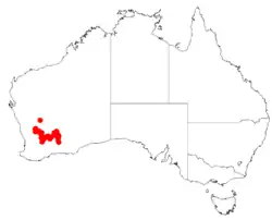 This species of wattle is native to the Avon Wheatbelt, Coolgardie and Murchison bioregions of Western Australia where it grows on low rises and plains in sandy or sometimes gravelly soils.[9] Its range extends from around Muntadgin in the west to as far east as Coolgardie, with at least one outlying population found around Wialki much further to the north where it is usually occurs in scrub or heath communities.[4]