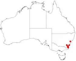 Blue bush grows in thickets, mainly on limestone slopes and ridges, but sometimes on quartzite, and is restricted to the eastern hills of the Great Dividing Range from near the Deua River to near the Kybeyan River.[2][4]