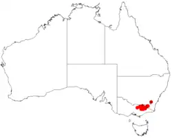 It is endemic to the southern parts of New South Wales and northern Victoria.[4] In Victoria the shrub is considered rare and is found in the Snowy Mountains, Victorian Alps and highlands with the bulk of the population confined to the montane and subalpine forests on the Buffalo Range and at Sassafras Gap.[2] It extends into the far south east of New South Wales in the snowy mountains at higher altitudes where it is found growing in granitic soils as a part of wet sclerophyll forest and woodlands.[3]