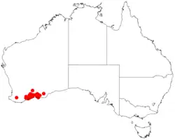 It is native to an area in the Wheatbelt, Goldfields-Esperance and Great Southern regions of Western Australia. The range of A dermatophylla extends from Lake Grace in the west to past Esperance in the east where it is found on undulating plains and low-lying areas including around salt flats growing in sandy, loamy or clay soils[3] as a part of in tall heath or mallee communities.[4]