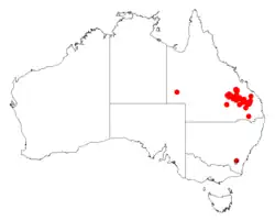 It has a scattered distribution from Brovinia in the south east to Expedition Range on the Blackdown Tableland of south eastern Queensland where it grows in sandy or loamy soils over or around sandstone as a part of open Eucalyptus woodland communities.[1]