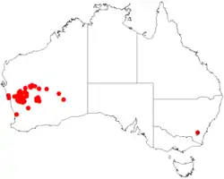 It is endemic to an area in the Goldfields-Esperance, Wheatbelt and Mid West regions of Western Australia.[1] It has a scattered distribution the south-western arid zone, and is found near Meekatharra and between Mullewa to Mount Magnet through to Rason Lake in the Great Victoria Desert. It is found on plains and rocky outcrops and grows in rocky clay loam soils and is commonly associated with Acacia aneura (mulga) communities.[2]