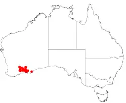It is native to an area in the southern Wheatbelt and Goldfields-Esperance regions of Western Australia where it is commonly situated on undulating plains growing in sandy, loamy and clay loam soils.[1] It has a scattered distribution from around Mount Holland and Lake King in the west to around Kumarl and Scaddan in the east where it is often a part of open scrub and shrubland mallee communities.[2]