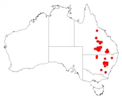 The shrub has a wide distribution through central New South Wales extending into Queensland. In New South Wales the bulk of the population is situated between Dubbo to around Gilgandra and Mendooran[2]