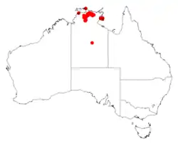 It is endemic to the top end of the Northern Territory and on a few of the islands in the Gulf of Carpentaria where it is found in crevices and on plateaux, alongside creeks and among rocks in thin sandy sandstone based soils.[1]