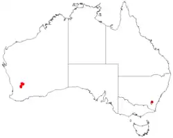 It is native to an area in the Wheatbelt region of Western Australia in the IBRA Avon Wheatbelt growing in clay, sandy loam and sandy soils. It has a limitied distribution from around Trayning[2] Kellerberrin and Mukinbudin where it is often part of open woodland communities.[1]
