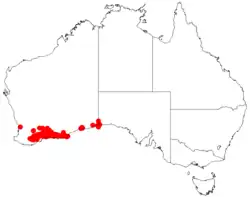 It is native to an area in the Great Southern and Goldfields-Esperance regions of Western Australia from around Gnowangerup in west through to the South Australian border in the east where it is found on sand dunes, undulating plains, depressions and margins of salt lakes where it grows in sandy, calcareous clay, gravelly to loamy soils.[2]