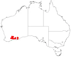 It is native to an area in the southern Wheatbelt and Goldfields-Esperance regions of Western Australia where it is commonly situated on undulating plains growing in clay-sand or sandy-loam or sandy soils.[2] It has a scattered and discontinuous distribution from around Lake King in the north west to around Munglinup in the south west with populations extending out to Grass Patch and the Mount Andrew and Ponier Rock in the east usually as a part of low open shrubland or tall mallee shrubland and low open woodland communities.[1]