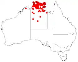It is native to a small area in the Kimberley region of Western Australia[2] and across tropical areas of the top end of the Northern Territory where it is quite common throughout Arnhem Land. It is often situated on coastal sand dunes or cliff area where it is found growing loamy or sandy and often gravelly soils on or around sandstone, granite or laterite as a part of Eucalyptus or Melaleuca woodland or shrubland communities.[1]