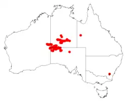 It is native to arid desert areas in the north western South Australia, southern Northern Territory[3] and the north eastern Goldfields region of Western Australia.[2] It is found along watercourses,[4] on rocky hillsides and valley floors and walls growing in shallow red sandy soils.[3] It is usually a part of tall shrubland communities with other Acacia and Eucalyptus species.[4]
