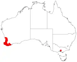 It is native to an area in from the south of New Norcia in the Wheatbelt, extending south through the Peel and South West to around Augusta and then east to around Walpole in the Great Southern region of Western Australia where it is found in along watercourses and other damp locations growing in lateritic soils.[4] In southwestern areas it is commonly part of the understorey in the Eucalyptus diversicolor forests and can form dense stands after bushfires following fire. In the north it is found less frequently and occurs as disjunct populations along creeks in Eucalyptus marginata forest and woodland communities.[1]