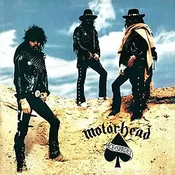 Like the song "Shoot You in the Back", the Ace of Spades artwork employs a classic wild west motif. Originally the idea for the album cover was to have it in a sepia tone and have gunfighters at a card table, but the band decided against it. They decided instead to have themselves in the desert dressed as cowboys. The 'Arizona desert-style' pictures used on the album sleeve and tour programme were taken during a photo session at a sandpit in Barnet.[7] Each of their cowboy outfits were based on different type of Western protagonist. Eddie was based on Clint Eastwood's character, The Man with No Name from the Dollars Trilogy. Phil's costume was based on Marlon Brando's character Rio in One-Eyed Jacks. Lemmy's costume was claimed by Phil to be inspired from Bret Maverick from the TV show Maverick. Contrary to popular belief, the sky was not real and was airbrushed in due to it being very cloudy that day.[8]