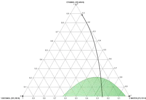 From a compound purification perspective, the main criticalities in the ABE/W product recovery are due to the water–alcohol mixture's non-ideal interactions leading to homogeneous and heterogeneous azeotropic species,[12] as shown by the ternary equilibrium diagram. This causes the separation by standard distillation to be particularly impractical but, on the other hand, allows the exploitation of the liquid–liquid demixing region both for analogous[13] and alternative separation processes.