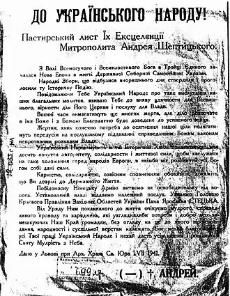 Apparently convinced that the group of Stetsko had the backing of the Germans, Metropolitan wrote a pastoral letter in which he exhorted the people to support the newly proclaimed government "the sacrifices which the final attainment of our goals require demand above all dutiful obedience to the just orders of the government which do not conflict with God’s law." Moreover, he declared: