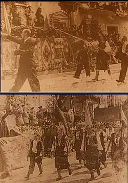 Late July 1941. Celebration of the Bandera's OUN Ukrainian statehood proclamation. Nazi and OUN-B officials at the stand with Nazi and OUN-B flags. OUN activists greeted them with a Nazi/OUN-B salute.