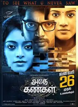 Adhe Kangal (transl. The Same Eyes) is a 2017 Indian Tamil-language romantic thriller film written and directed by debutant Rohin Venkatesan and produced by C. V. Kumar. The film stars Kalaiyarasan, Janani and Sshivada, with Bala Saravanan in a supporting role. The music was composed by Ghibran with cinematography by Ravivarman Neelamegam and editing by Leo John Paul. The film had a theatrical release on 26 January 2017, coinciding with India's Republic Day. It was remade in Kannada as Samhaara (2018)[1] and in Telugu as Neevevaro (2018).[2]