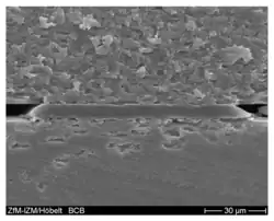 It does release only small amounts of by-products during curing which enables a void-free bond. This polymer ensures very strong bonds and excellent chemical resistance to numerous acids, alkalines and solvents. The BCB is over 90% transparent to visible light that enables the use for optical MEMS applications.[16]