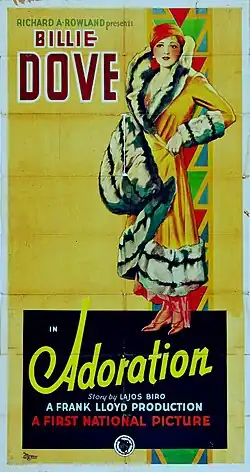 Adoration is a 1928 American synchronized sound drama film. While the film has no audible dialog, it was released with a synchronized musical score with sound effects using the sound-on-disc Vitaphone process. The film was released by First National Pictures, a subsidiary of Warner Bros., and directed by Frank Lloyd. It stars Billie Dove, Antonio Moreno, Emile Chautard and Lucy Doraine. The film was also issued in a shorter silent version for theatres that were not yet wired for sound.[1][2]