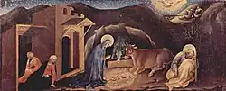 The frame is also a work of art in itself, characterized by three cusps with tondos portraying Christ Blessing (center) and the Annunciation (with the Archangel Gabriel on the left and the Madonna on the right).[15] The three main arches of the frame help to clearly separate these narratives from the three main scenes below that depict the journey of the Magi.[15] The predella also has three rectangular paintings with scenes of Jesus' childhood: the Nativity, the Flight into Egypt and the Presentation at the Temple (the latter is a copy, since the original was removed from the altarpiece and is in the Louvre in Paris).[14][16] As the first altarpiece made with panel and frame in two separate pieces, it the first independent frame as we know it today.[17] Gentile's incorporation of this completely self-supporting frame intended to protect the painting instead of being inseparable from the painting helped lead to this modern idea of a frame.[18]