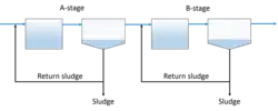 Influent organic matter is removed in the A-stage mainly by flocculation and sorption to sludge due to the high loading rates (2–10 g BOD • g VSS−1 • d−1) and low sludge age (typically 4–10 h). Hydrolysis of complex organic molecules occurs improving biodegradability of the influent of the B-stage. High loading rates and low sludge age favours development of dynamic biocoenosis with a large fraction of microorganisms present in the exponential growth phase. Diverse sludge biocoenosis increase variety of organic compounds that can be degraded in the A-stage and makes the process more stable towards the shock loads.[3] Altogether, up to 80% of the influent organic matter can be removed in the A-stage.[3] The required reactor volume and oxygen supply are lower if compared to the removal in the conventional activated sludge process.