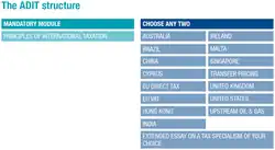 In addition to the ADIT certificate issued upon achievement of the full ADIT qualification, standalone certificates are also available for students who complete either the 'Module 1 Principles of International Taxation', 'Module 3.01 EU Direct Tax option, 'Module 3.02 EU VAT option', 'Module 3.03 Transfer Pricing option', 'Module 3.04 Upstream Oil and Gas option' or 'Module 3.05 Banking option' exam. A modular certificate is available to any ADIT student who has passed the exams for both Module 1 Principles of International Taxation and one option module.