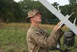 The AeroVironment RQ-14 Dragon Eye is a small reconnaissance miniature UAV developed by the Naval Research Laboratory and the Marine Corps Warfighting Laboratory for use by the United States Marine Corps. It was designed to provide reconnaissance, surveillance, and target acquisition (RSTA) for the USMC company, platoon, and squad levels. It can provide this to around 10 kilometres (5.4 nmi) in its vicinity.[2]
