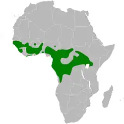 Its natural habitats are moist lowland forests, mangrove forests, gallery forest, montane forests, gardens, wooded farmland and moist savanna.[3][4]