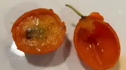 It is an evergreen small tree, growing to 6–18 m tall. The leaves are borne in opposite pairs or whorls of 3–4, each leaf blue-green, oval, 6–11 cm long and 3–5.5 cm broad. The flowers are produced in clusters on the stems. The fruit is a small, bright, orange, thin-skinned berry 1–4 cm diameter, with one single large seed; the small yield of edible fruit is pleasantly sweet, yet acidic, but also containing a latex that some people find unpleasant.[3][4]