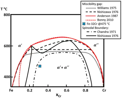 - ^ a b Soriano-Vargas, Orlando; Avila-Davila, Erika O.; Lopez-Hirata, Victor M.; Cayetano-Castro, Nicolas; Gonzalez-Velazquez, Jorge L. (May 2010). "Effect of spinodal decomposition on the mechanical behavior of Fe–Cr alloys". Materials Science and Engineering: A. 527 (12): 2910–2914. doi:10.1016/j.msea.2010.01.020. Archived from the original on 3 August 2022. Retrieved 14 October 2022.