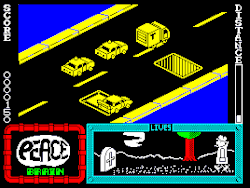 There are four sections of the game, each loaded separately. The first level sees Agent X driving a car which travels along a diagonally scrolling road, and is under constant attack from other road users who try to ram it off the road or trap it behind obstacles. The player can make the car jump to avoid crashes. The next level is a basic fighting game; enemies approach from the left and right and must be defeated by kicking or punching them. The third level is a first-person target shooting game in which various objects are hurled towards the screen and must be shot. The final level involves the player controlling Agent X in a helicopter, avoiding missiles and crushers. The player must negotiate a cave complex using the helicopter, collect a bomb, then return it through the caves to destroy the professor's headquarters.[2]