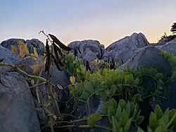 The main crops in this area are millet, sorghum and cowpea (see Figures 4 to 6), while groundnut and sesame are considered minor crops.[10] Guna (cow) melon (Citrullus lanatus) has been recently added to crop production for the market. It requires only one fall of rain, is planted late in the season, and grows on moisture that is left in the soil until it is harvested during the months preceding the next year's rains. This crop is a significant supplier of edible oil.[1] Plants grown as field boundaries include the henna bush (Lawsonia inermis) as well as various grasses. Intercrop spreads are also planted among the grains; they often consist of cowpeas or groundnuts, which are nitrogen-fixing plants. A density of mature trees is also maintained.[3]